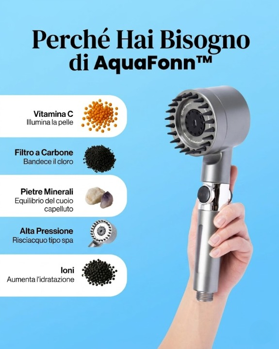 La rivoluzione del benessere inizia dall'acqua. Proteggi la tua bellezza naturale con il sistema di filtrazione avanzata e l'alta pressione firmata AquaFonn.
